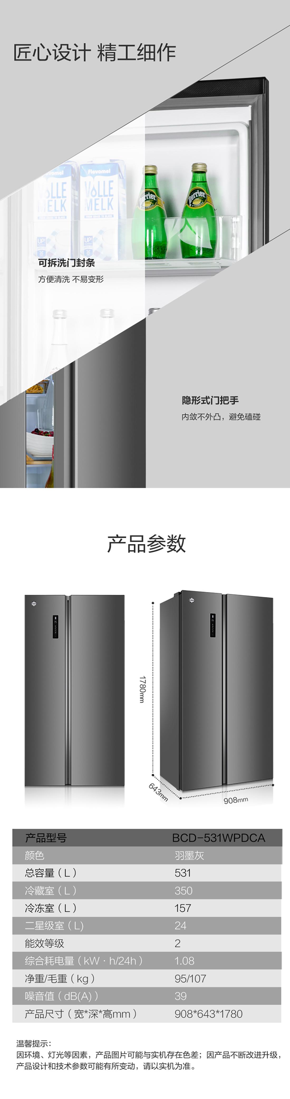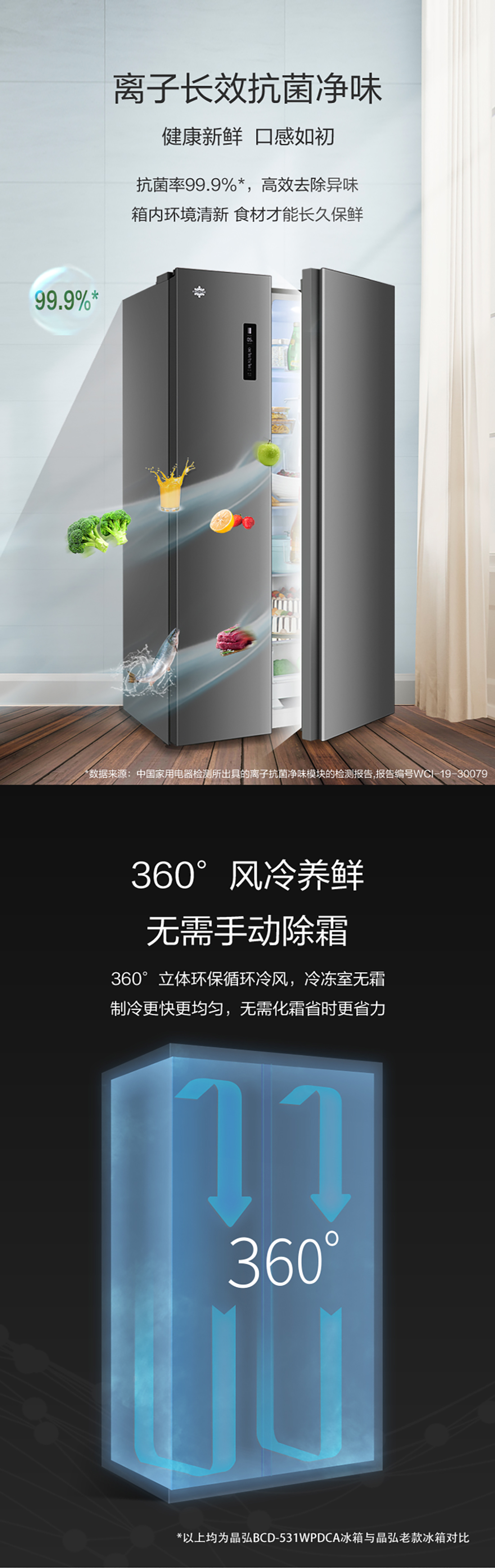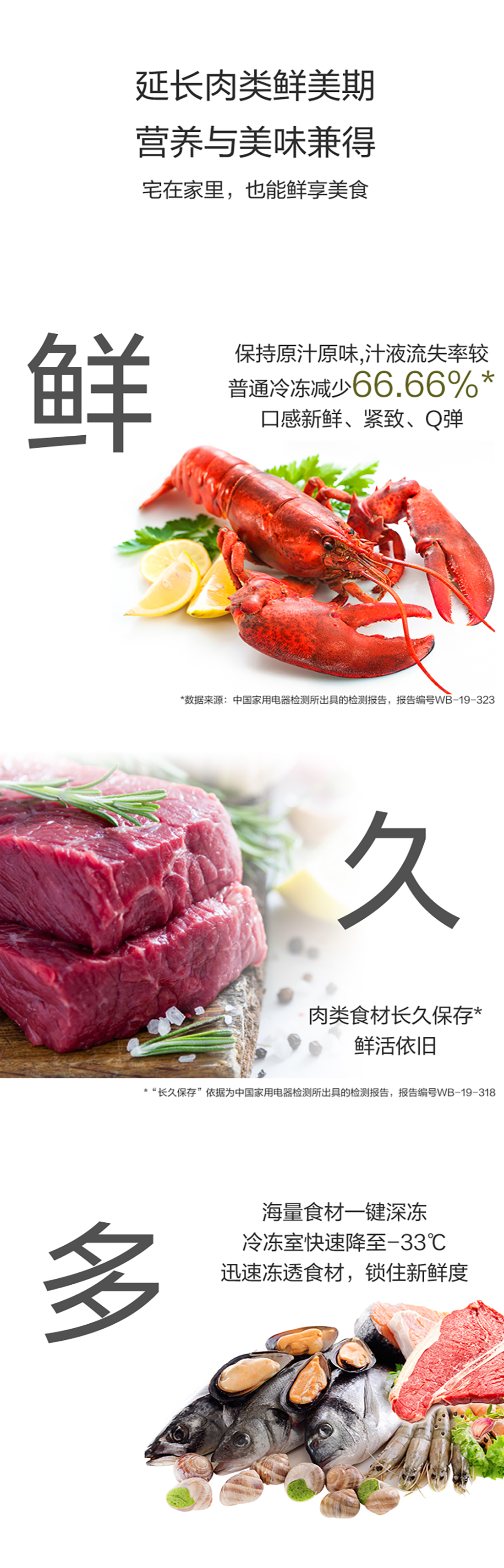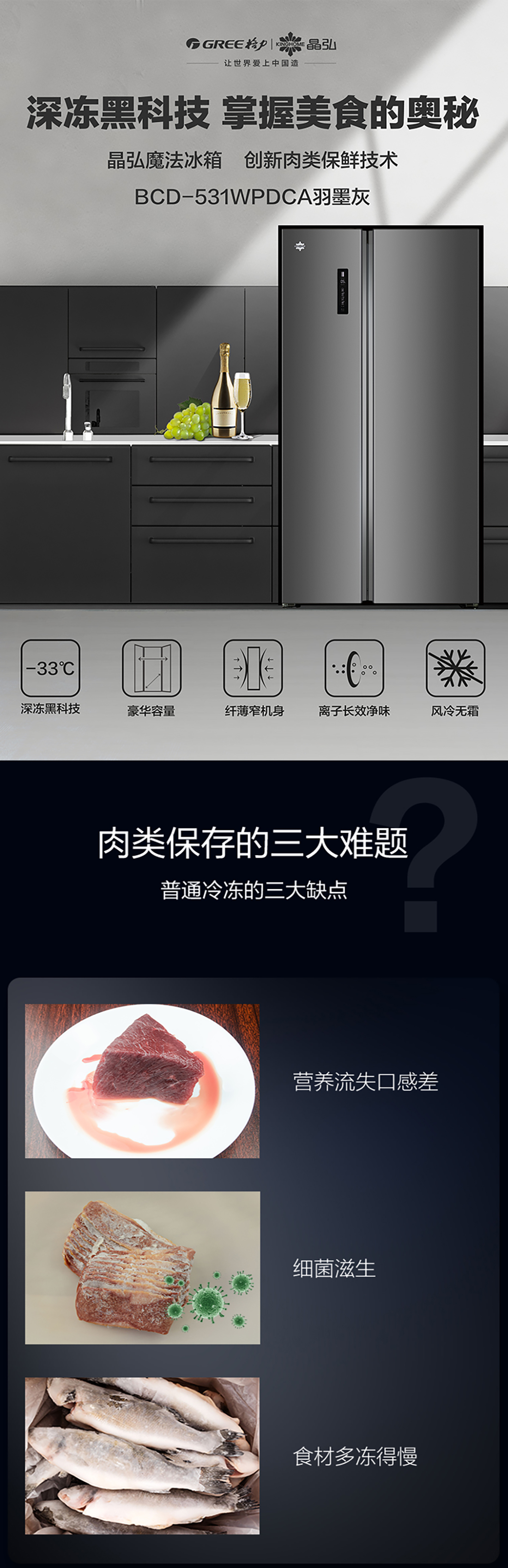 搭载-33℃深冻锁鲜科技,肉汁饱满更长久。采用离子长效抗菌净味,抗菌率高达99.9%。风冷无霜,拒绝风干,食材水润新鲜。