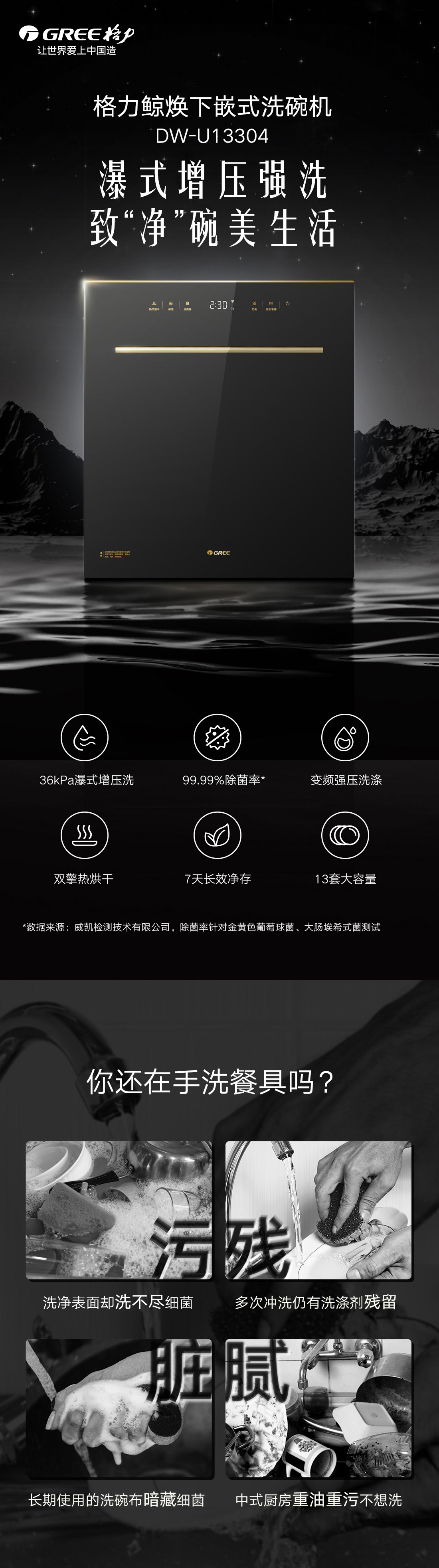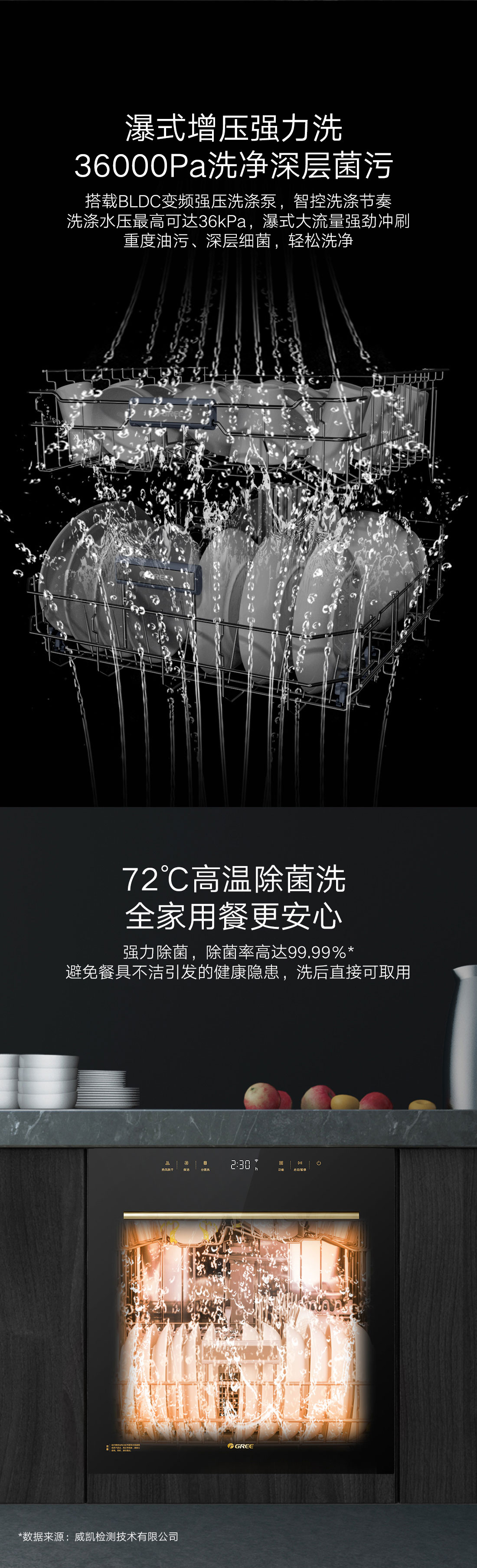 搭载瀑式增压强洗科技,36KPa洗净深层菌污,除菌率达99.99%;洗烘除存一体,存放7天也干爽