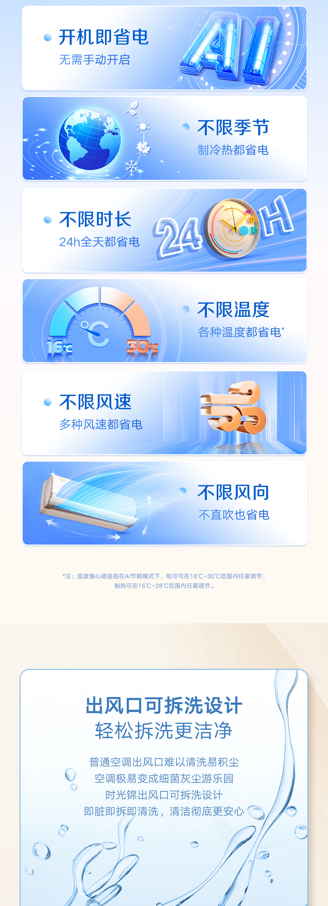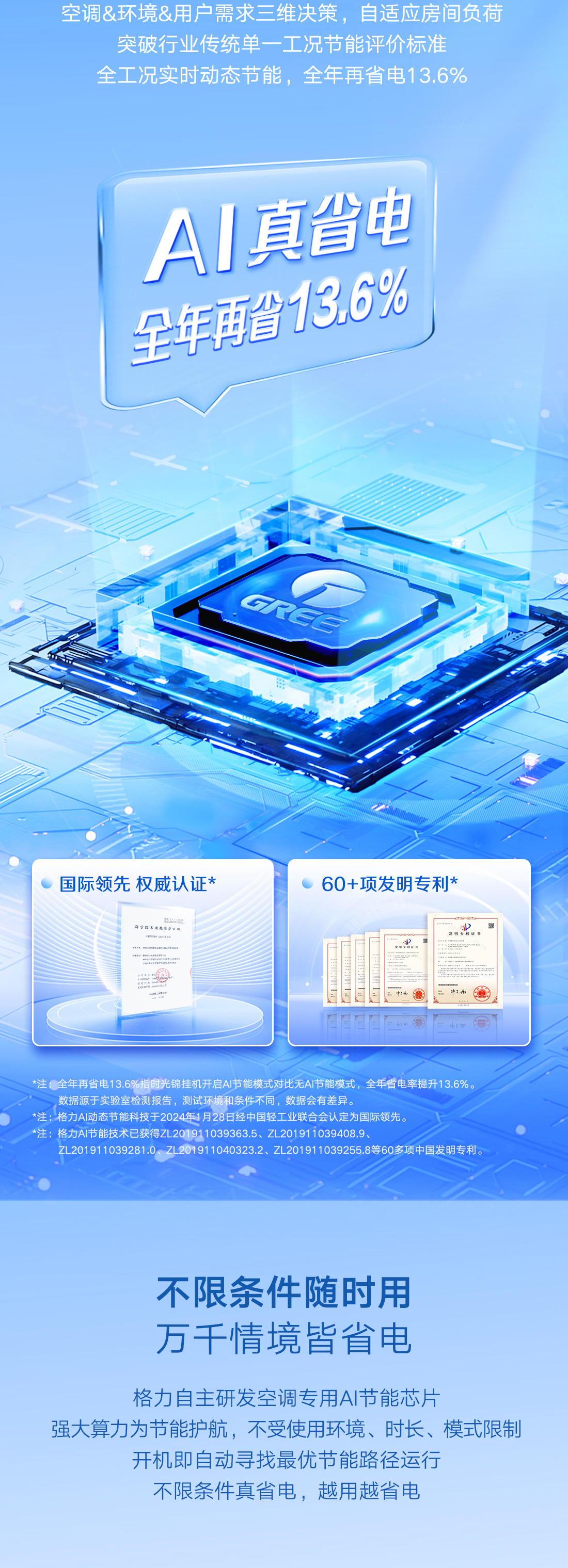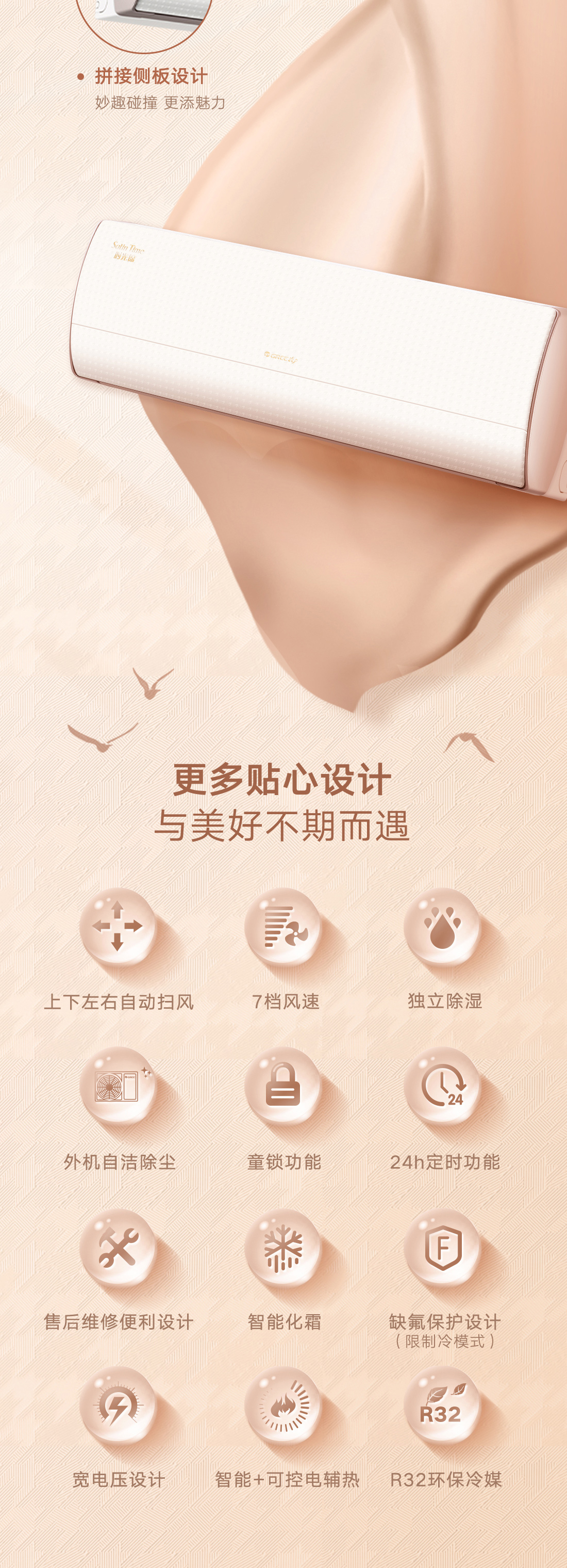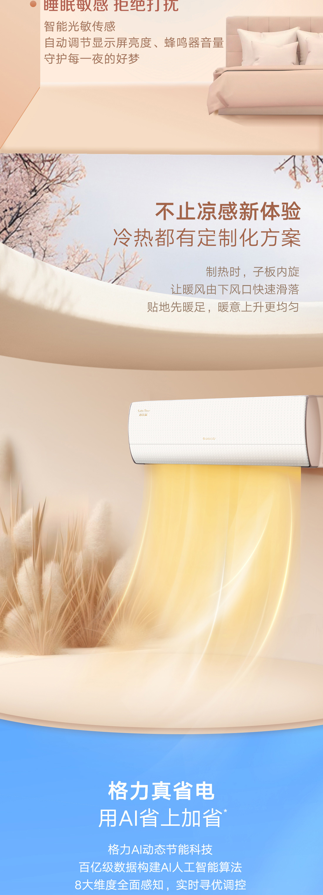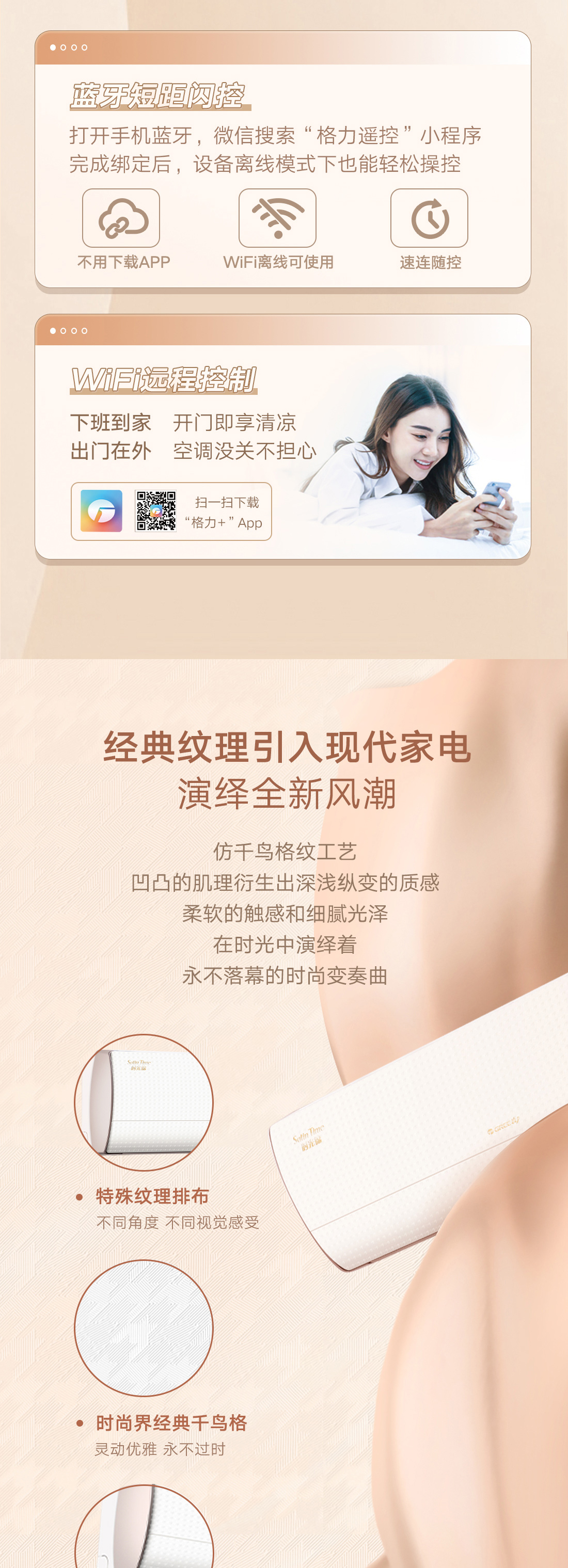 格力时光锦挂机,经典仿千鸟格纹,演绎全新风潮,搭载运动子母导风板,实现冷风不直吹,全域有凉感。更有国际领先AI动态节能科技,全工况实时动态节能,全年再省电13.6%。