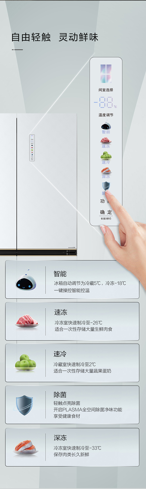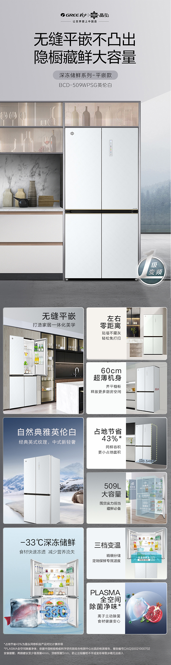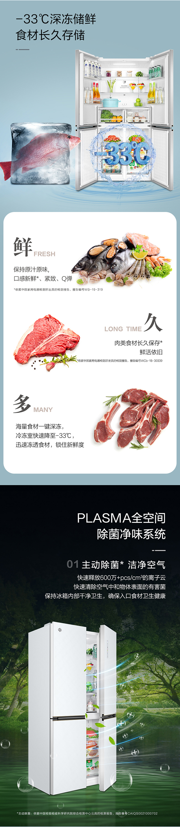 -33摄氏度深冻储鲜;PLASMA全空间除菌净味;平齐不凸出;双通道循环散热