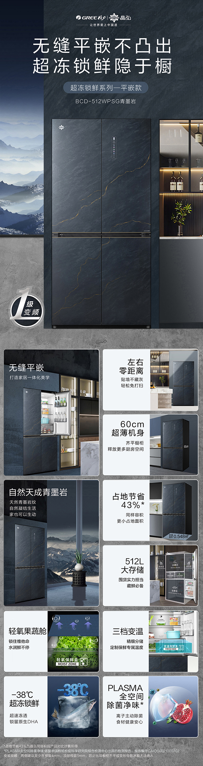 -38℃超冻锁鲜;PLASMA全空间除菌净味;平齐不凸出;双通道循环散热