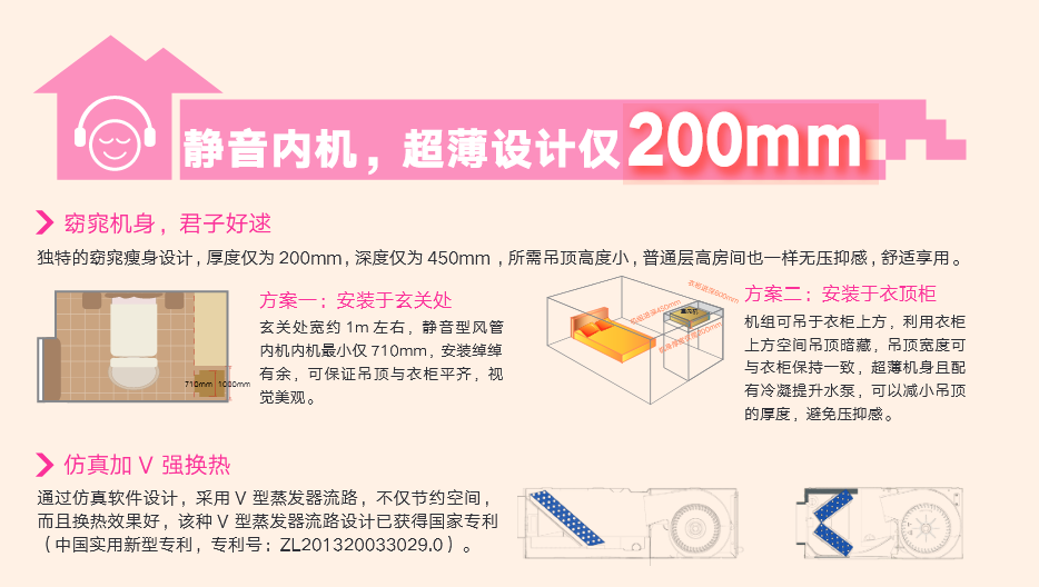 采用“V”型换热器,开机初期,根据室内温度与设定温度自动调节至高频状态,缩短制冷或制热时间,提升舒适度